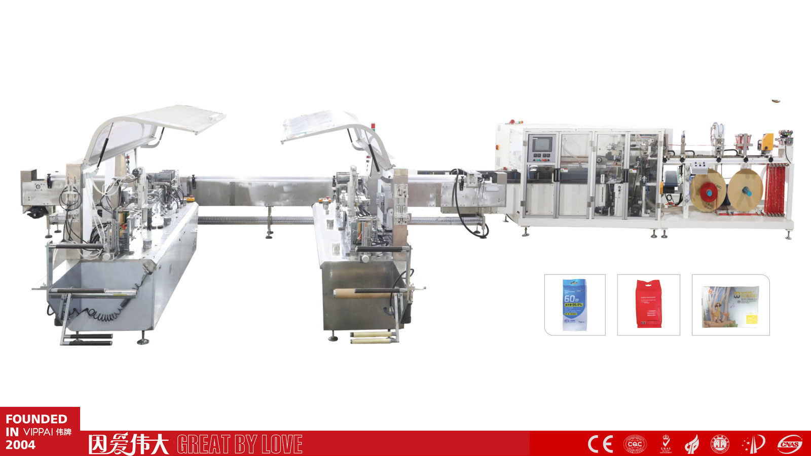 VPD250+VPD900M全自动湿巾套袋机连线 根据客户的要求,设计全自动IM官方网页版跟装盒机或套袋机连线